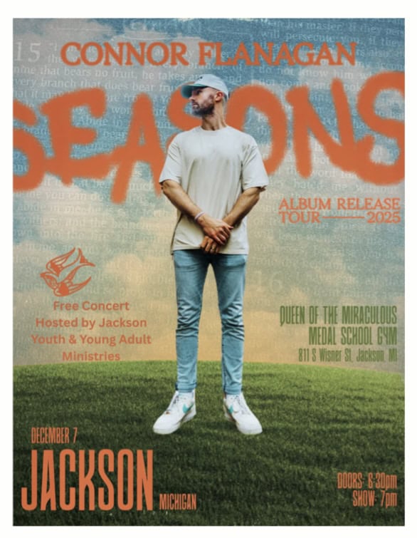 The Jackson Youth Group and Young Adult Group invite you to a free Christian Hip Hop concert in the Queens School Gym at 7pm next Sunday December 7th featuring Christian artist Connor Flanagan.
